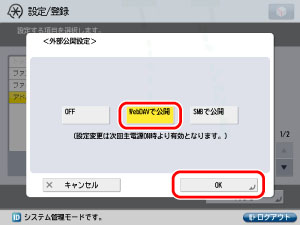 (設定/登録)→[ファンクション設定]→[ファイル保存/利用]→[アドバンスドボックス設定]→[外部公開設定]