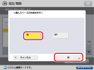 (設定/登録)→[ファンクション設定]→[ファイル保存/利用]→[アドバンスドボックス設定]→[個人スペースの作成を許可]