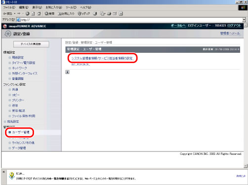 リモートUIにアクセスして、[設定/登録]→[ユーザー管理]→[システム管理者情報/サービス担当者情報の設定]をクリックします。