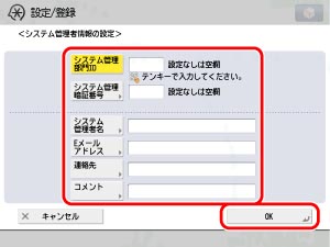 (設定/登録)→[管理設定]→[ユーザー管理]→[システム管理者情報の設定]を押します。