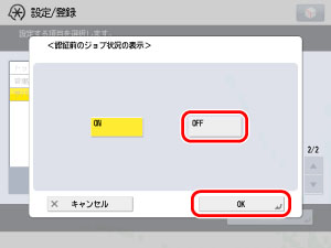 [認証前のジョブ状況の表示]を押したあと、[OFF]→[OK]を押します。