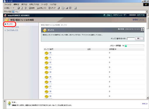 リモートUIにアクセスして、[受信/保存ファイルの利用]→[ボックス]をクリックします。