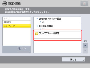 (設定/登録)→[環境設定]→[ネットワーク]→[ファイアウォール設定]を押します。