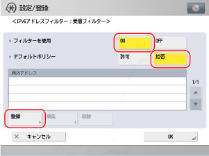 [フィルターを使用]を[ON]に、[デフォルトポリシー]を[拒否]に設定して、[登録]を押します。