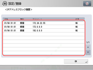 [設定/登録]→<環境設定>の[ネットワーク]→[IPアドレスブロック履歴]