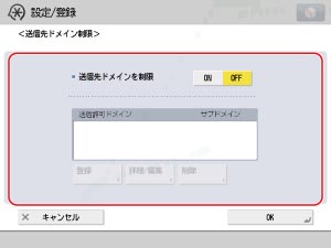 (設定/登録)→[ファンクション設定]→[送信]→[Eメール/Iファクス設定]→[送信先ドメイン制限]