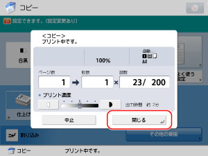 先行するジョブの終了後にコピーが開始します。「ジョブの予約がいっぱいです。前のジョブが終了してからもう一度実行してください。」というメッセージが表示された場合は、[OK]を押して前のジョブが終了したあとに操作をやりなおしてください。