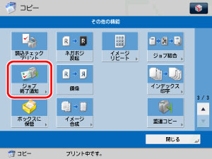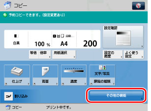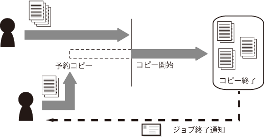 ジョブ実行中は、実行中ジョブが終了しないと次のジョブを実行できません。たとえば、大量のコピーが実行されている場合は、コピーがすべて終わるまで待つことになります。そのようなときには、予約コピー機能を使用すれば、コピー中でも原稿の読み込みができ、実行中コピーが終わり次第コピーを開始できます。また、自分のコピーが終了したら通知を受け取れるよう設定することで、効率よくコピーを実行できます。