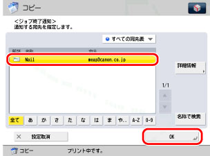 ジョブ終了通知を送る宛先を選択したあと、[OK]を押します。