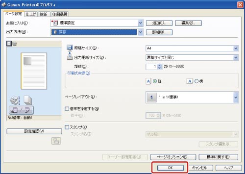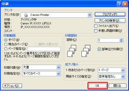 印字の種類、印字の位置と向きを選択したあと、[OK]を押します。