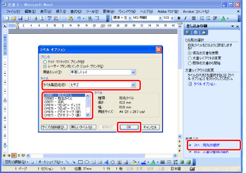 [ひな形の選択]で[文書レイアウトの変更]を選択し、[ラベルオプション]をクリックします。