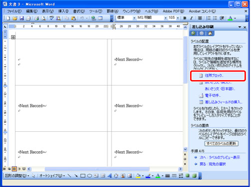 [ラベルの配置]で[住所ブロック]をクリックします。