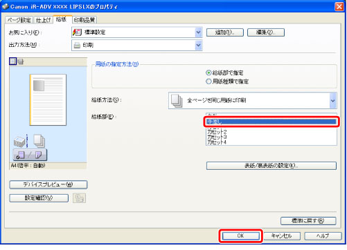ラベル用紙をセットした給紙部を選択し、[OK]をクリックします。