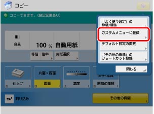 コピー、スキャンして送信、スキャンして保存機能などでよく使用する機能の設定をカスタムメニューに登録すると、他の複合機でも同じ設定を呼び出せます。