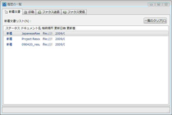 新着文書通知アイコンをダブルクリック、または新着文書通知ウィンドウの[履歴一覧]をダブルクリックすると、[履歴の一覧]画面が表示されます。[履歴の一覧]画面で[新着文書リスト]の項目を選択してダブルクリックすると、Desktop Browserが起動し、新着文書のあるフォルダーの中の項目がファイルリストビューペインに表示されます。