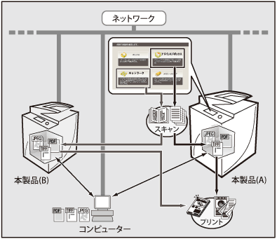 imageRUNNER ADVANCEから読み込んだ原稿を、PDF、JPEG、TIFFなどのファイル形式で保存したり、ファイルを本機からプリントしたりできます。