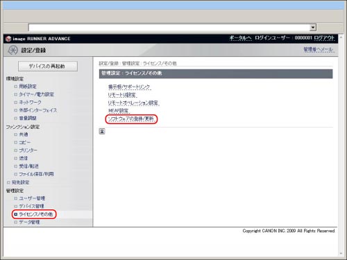 リモートUI のトップページから、[設定/登録]→[ライセンス/その他]→[ソフトウェアの登録/更新]をクリック