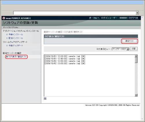[ソフトウェアの管理設定]→[通信テスト]を押す