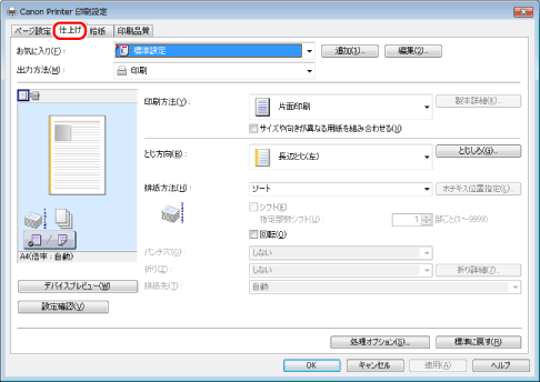 製本印刷時は、[仕上げ]ページの[排紙方法]を指定して出力はできません。