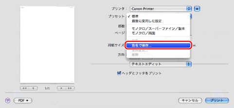 保存した設定は、[プリント]ダイアログの[プリセット]に表示されます。