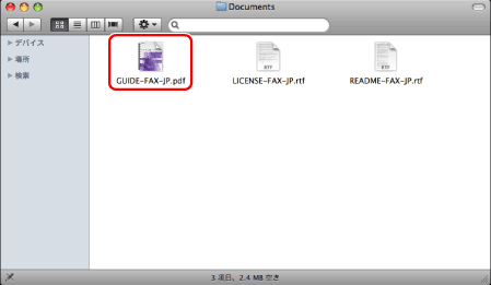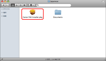 MacにUser Software CD-ROMセットします。CD-ROM内の[FAX] - [Japanese]フォルダーの中に、インストーラーが入っています。インストール手順の詳細については、「Mac FAXドライバインストールガイド」を参照してください。