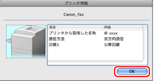 [プリンタ情報]ダイアログの上部に表示されているファクスドライバー名と、[プリンタから取得した名称]に表示されているファクス名が正しく対応していない場合は、ファクスの機能を正しく使用できないことがあります。この場合は、[システム環境設定]で追加したファクスを削除して、もう一度ファクスを追加しなおしてください。詳細は、「Mac FAXドライバインストールガイド」を参照してください。(→「インストールする」)