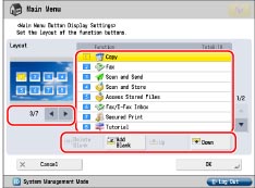 If the number of function buttons exceeds the number of buttons in the layout specified for <Main Menu Button Display Settings>, the excess buttons are displayed after page 2 of the Main Menu screen. A maximum of 16 buttons can be displayed on the Main Menu screen.