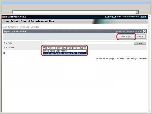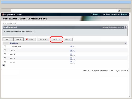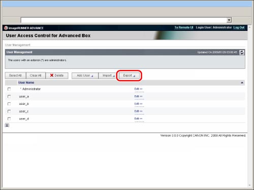 Export user information when you back up data on the Advanced Space to use on another imageRUNNER ADVANCE series machine. You can use the data stored on the Advanced Space if you import the user information into the other machine. For information on backing up/restoring stored data, see "Backing Up Stored Data."