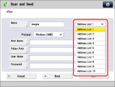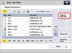 The first character that you enter for the name is used for sorting the destination list when you press keys, such as [ABC], [DEF], and [GHI], on the Address Book screen. If [Search by Name] is pressed on the Address Book screen, a screen for narrowing the search in the Address Book appears.