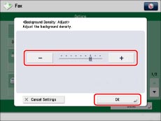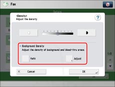 If you adjust the background density by pressing [Adjust] for <Background Density>, the [Auto] setting is cancelled. Similarly, if you press [Auto] while making manual adjustments in [Adjust], your adjustments are cancelled. The machine automatically adjusts the density to match the background.
