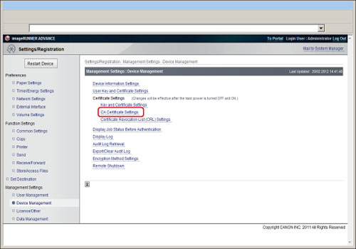 Install the CA certificate file using the Remote UI. The installed CA certificate file can be used as a CA certificate by registering it from the control panel of the machine.