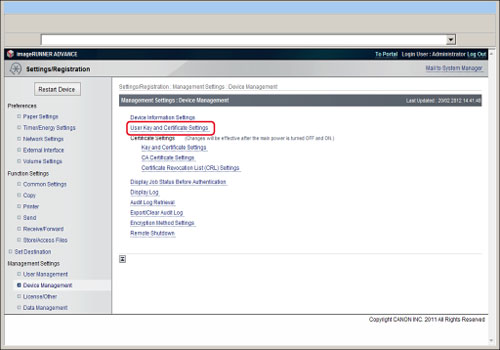 You can use the Remote UI to install the key pair, user certificate, and certificate revocation list required for user signatures in the machine.