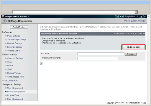 (See "Registering a Key Pair File and Server Certificate File Installed from a Computer.")Install the key pair file and server certificate file using the Remote UI. The installed key pair file and server certificate file can be used as a key pair and server certificate by registering them from the control panel of the machine.