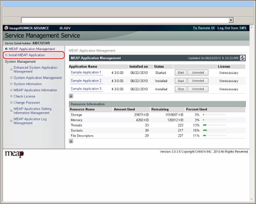 You can confirm the hard disk space allocated to MEAP applications in [Storage], under [Resource Information] displayed in the [MEAP Application Management] page.