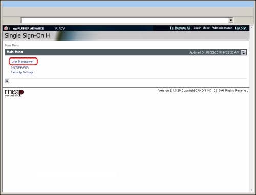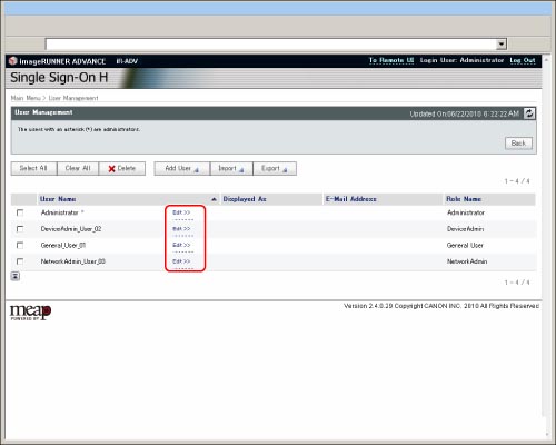 Only the Local Device Authentication administrator can register/edit user data on the [User Management] page. General users can only change their own password.