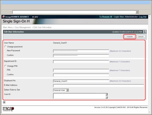 If you select [Administrator] for [Select Role to Set], the user name and password can be used when you log in using Local Device Authentication.