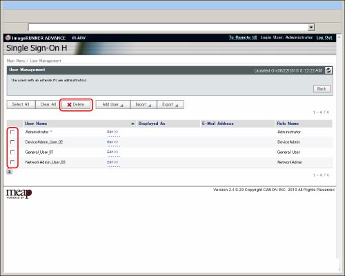The user data that is logged in as the System Administrator (Administrator) cannot be deleted.