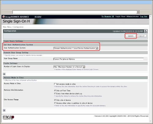 In addition to the Local Device Authentication administrator, the Domain Authentication administrator can also set the user authentication system.