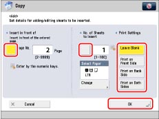 If you are using paper that already has printing on it (e.g., company logo) as your sheet insertion, then you must select [Leave Blank]. Otherwise, the machine will copy on the preprinted paper.