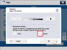 If you adjust the background density by pressing [Adjust] for <Background Density>, the [Auto] setting is cancelled. Similarly, if you press [Auto] while making manual adjustments in [Adjust], your adjustments are cancelled. The machine automatically adjusts the density to match the background.