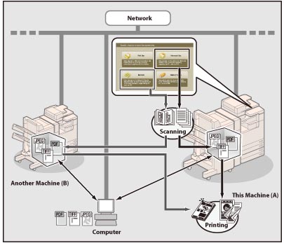 You can scan an original with the machine and store it (in file formats such as PDF, JPEG, or TIFF), and print the stored file from this machine at any time using your desired print settings.