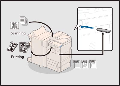 Memory media is a storage location that can be used by connecting USB memory to the USB port of the machine. You can scan a document with this machine and store it in memory media in various file formats that can be used on your computer. You can also print files stored in memory media on this machine at any time with your desired print settings.