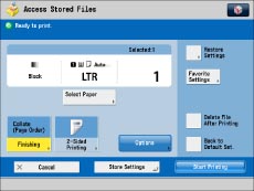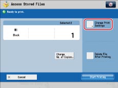If you want to print a file stored in the machine from a computer or using [Store in Mail Box] of the Copy function with the settings that were set when the file was stored, do not print the file from the Change Print Settings screen. If you print the file from the Change Print Settings screen, the file may not be printed with the same settings that were set when the file was stored.