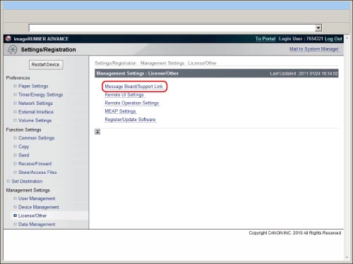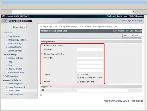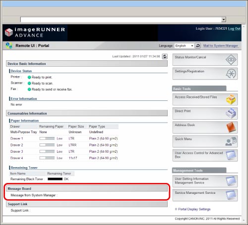 If you select [Display on Portal], the message board is displayed on the portal page of the Remote UI.