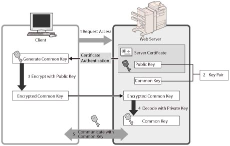 When the user accesses the machine from their computer, the server certificate for SSL and the public key for the server are requested.