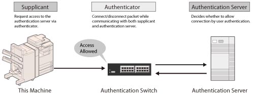 Manages all of the authentication information via the authentication server (RADIUS: Remote Authentication Dial In User Service) and authenticates the supplicant. You can prevent unauthorized access because only the supplicant authenticated by the RADIUS server has permission to connect to the network by the authenticator.
