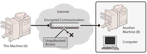 You can perform safe encrypted communication when the user is accessing the machine via a Web browser by installing a server certificate to the machine. With SSL communication, a common key that can only be used by the user and the machine is generated using the server certificate and public key. Doing so will help prevent data interception and theft. See