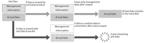 The machine separates and stores the job data when copying, sending, receiving, and printing into management information and actual data. The management information is automatically erased when the job is complete, but the actual data is stored in the hard disk.