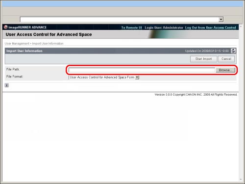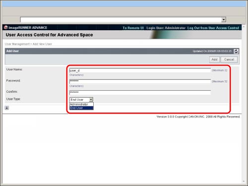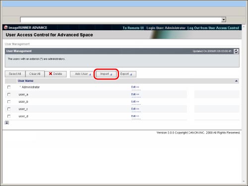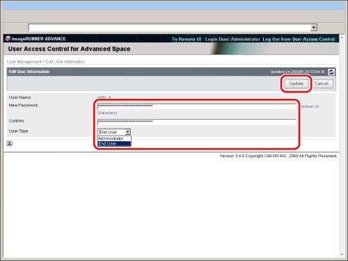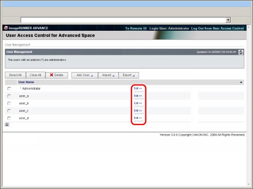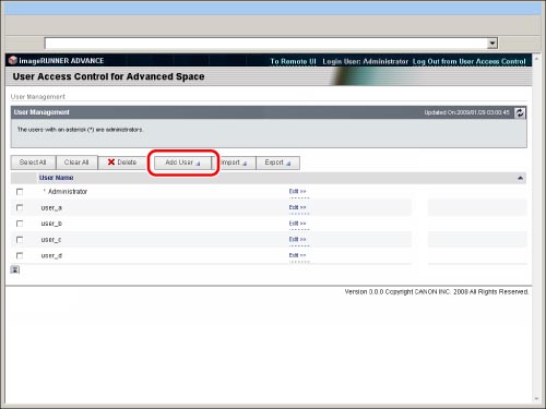 Only the Advanced Space administrator can register/edit the user information on the [User Management] page of [User Access Control for Advanced Space]. General users can only change their own password. (See "Editing User Information by General Users.")