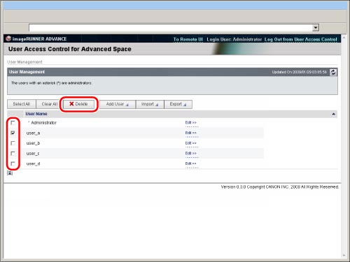 When you delete user information, it is recommended that you also delete any personal spaces that the user has created. The personal spaces that each user has created can be deleted using the Remote UI. For more information, see "Specifying the Advanced Space Settings."